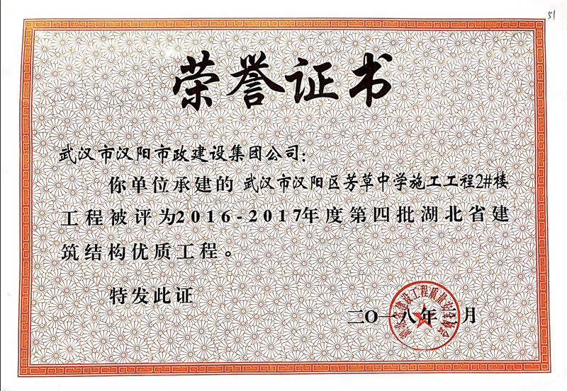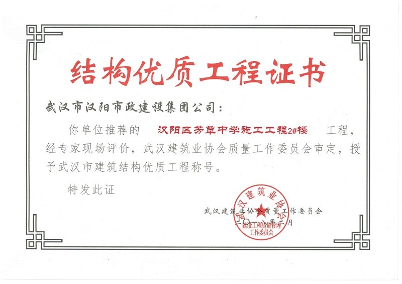 結(jié)構(gòu)優(yōu)質(zhì)工程證書(芳草中學(xué)綜合2號樓)